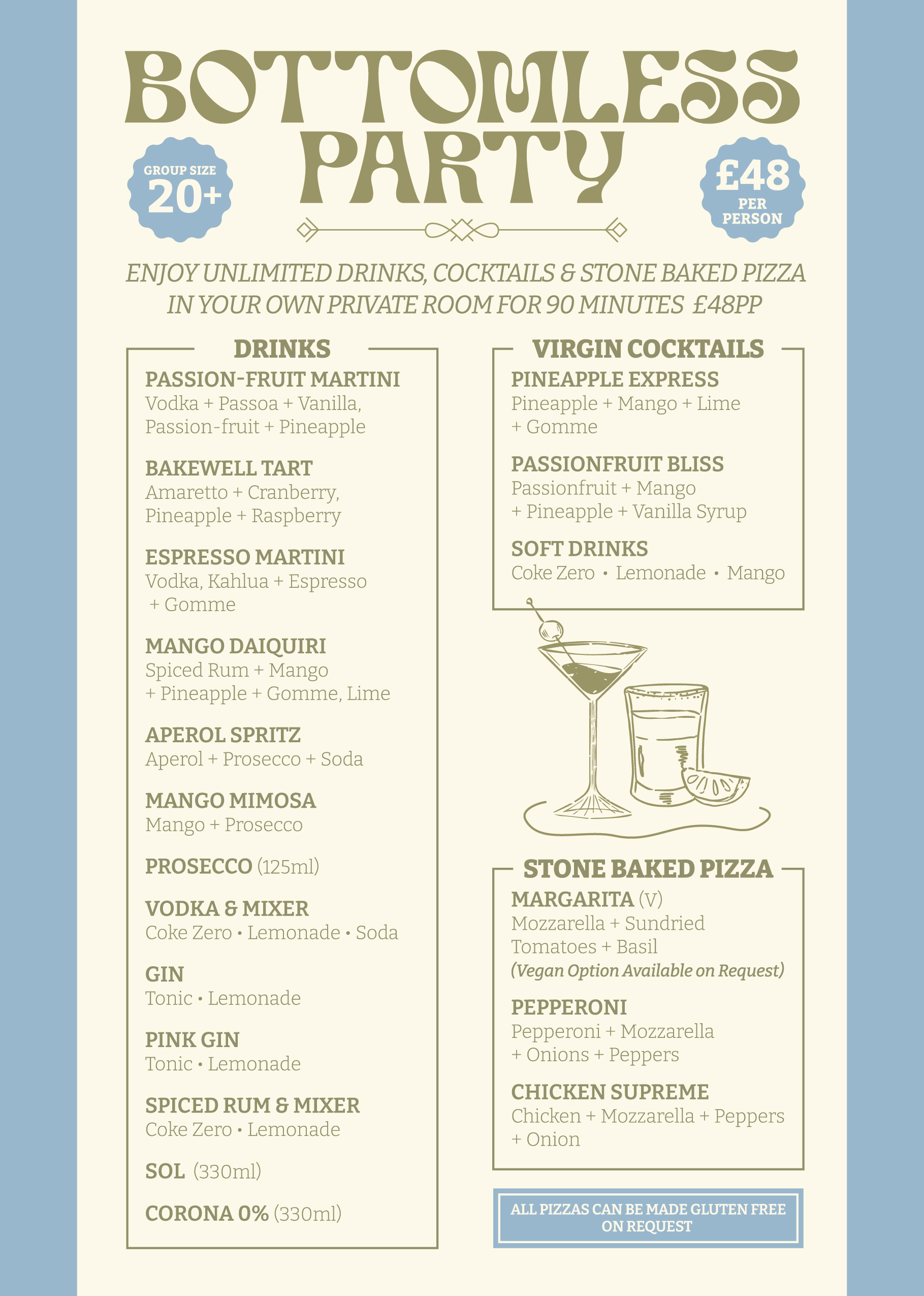 Enjoy unlimited drinks, cocktails & stone baked pizza in your own private room for 1.5 hours. Bookings can only be made for groups of 20+ people. T&C’s apply. Reserve your table via the booking link or by calling 01482 221221.